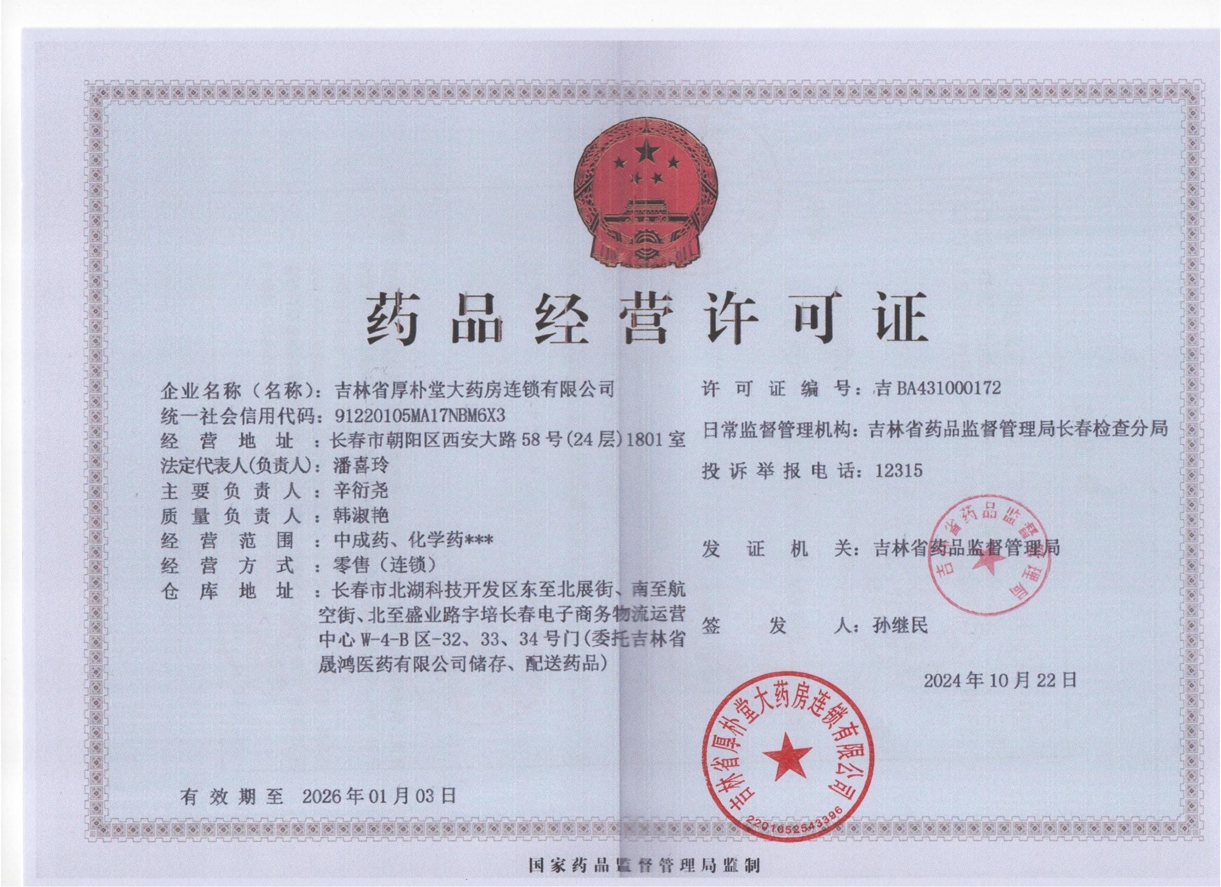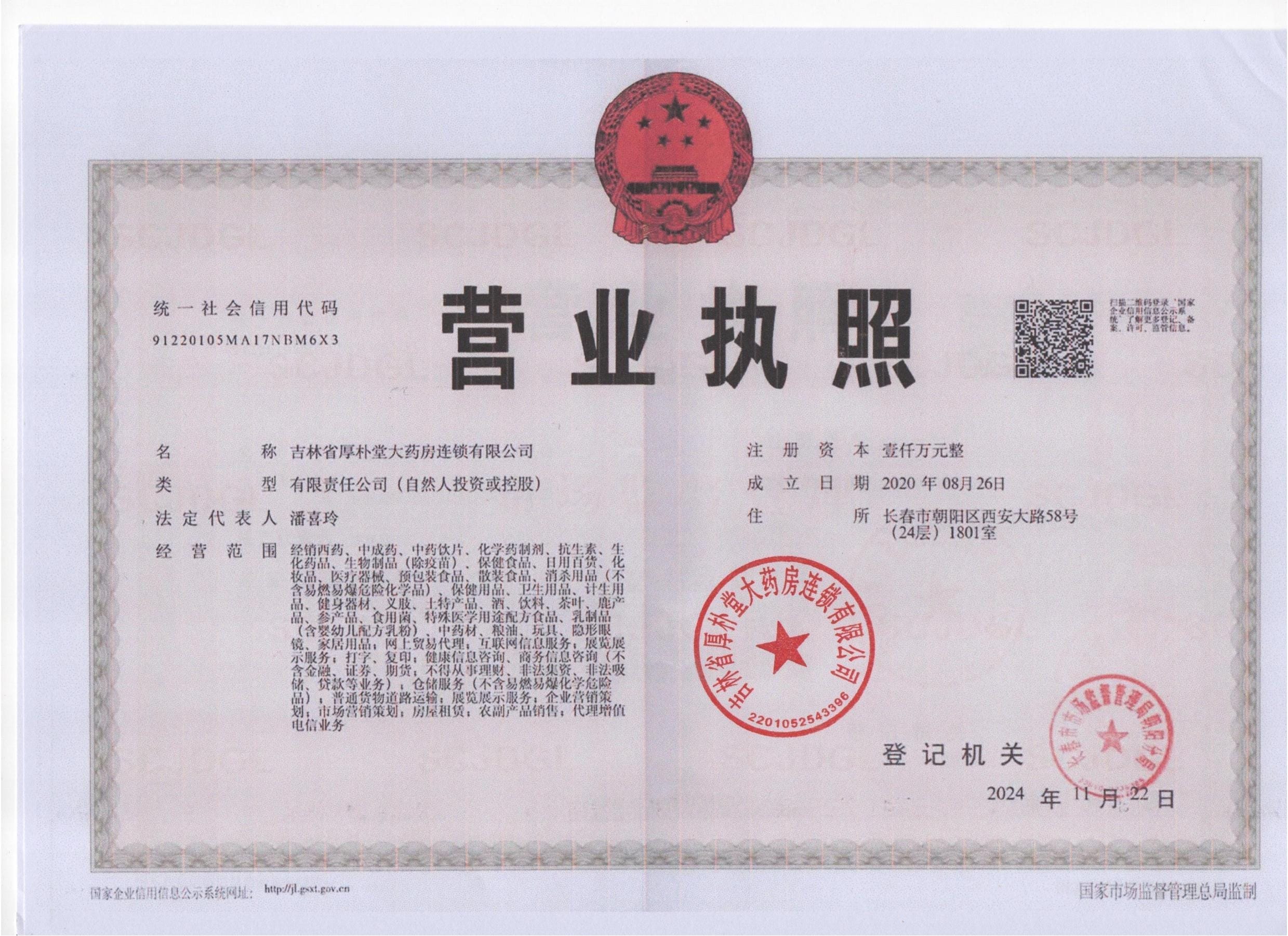 公司简介:吉林省厚朴堂大药房连锁有限公司于2020年08月26日工商注册,公司法定代表人为潘喜玲。公司注册地址:长春市朝阳区西安大路58号(24层)1801室。经营范围:经销西药、中成药、中药饮片、化学药制剂、抗生素、生化药品、生物制品(除疫苗)保健食品、日用百货、化妆品、医疗器械、预包装食品、散装食品、消杀用品(不含易燃易爆危险化学品)、保健用品、卫生用品、计生用品、健身器材、义肢、土特产品、酒、饮料、茶叶、鹿产品、参产品、食用菌、特殊医学用途配方食品、乳制品(含婴幼儿配方乳粉)、中药材、粮油、玩具、隐形眼镜、家具用品;网上贸易代理;互联网信息服务;展览展示服务;打字、复印;健康信息咨询、商务信息咨询(不含金融、证券、期货;不得从事理财、非法集资、非法吸储、贷款等业务);仓储服务(不含易燃易爆化学危险品);普通货物道路运输;展览展示服务;企业营销策划;市场营销策划房屋租赁;农副产品销售;代理增值电信业务。